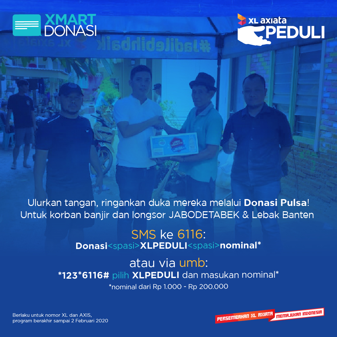 MAJALAH ICT – Jakarta. Dampak bencana banjir bandang-tanah longsor di Kab. Lebak dan Kab. Bogor hingga kini masih dirasakan masyarakat yang menjadi korban bencana. Berdasarkan data dari Badan Penanggulangan Bencana Daerah (BPBD) Kab. Lebak, Banten dan Kab. Bogor, ribuan korban masih menempati tempat-tempat pengungsian yang tersebar di beberapa wilayah di Kab. Lebak, seperti, Lebak Gedong, Cipanas, Sajira, Pajagan, Curugbitung, Maja dan Cimarga, sedangkan di Kab. Bogor berada di Desa Cisarua, Cileuksa, Kiarasari, Kiarapandak, Harkat Jaya, Urug, Pasir Madang, Jaya Raharja, Sukamulih dan Sipayung. PT XL Axiata, Tbk (XL Axiata) melalui program tanggung jawab sosial perusahaan (CSR) berinisiatif membuka layanan SMS Donasi (Xmart Donasi) dengan mengajak seluruh pelanggan setia XL Axiata berdonasi untuk membantu para korban bencana yang sangat membutuhkan bantuan untuk memenuhi kebutuhan sehari-hari selama di pengungsian. Layanan Xmart Donasi dibuka mulai hari ini hingga 2 Februari 2020.